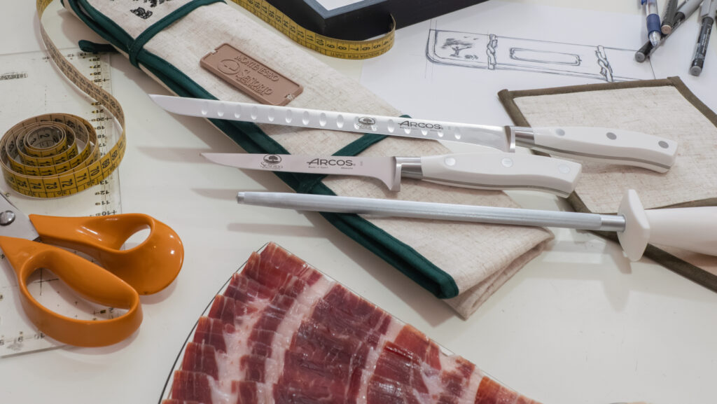 Para completar la experiencia, Arcos aporta un set exclusivo de dos cuchillos Riviera Blanc y una chaira, forjados en una sola pieza para garantizar precisión, equilibrio y una ergonomía impecable. Instrumentos pensados para respetar la estructura del jamón ibérico y permitir un corte fino, limpio y armónico. Porque en este tipo de productos, el placer empieza por la técnica.
