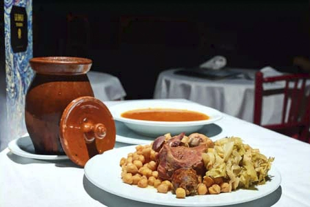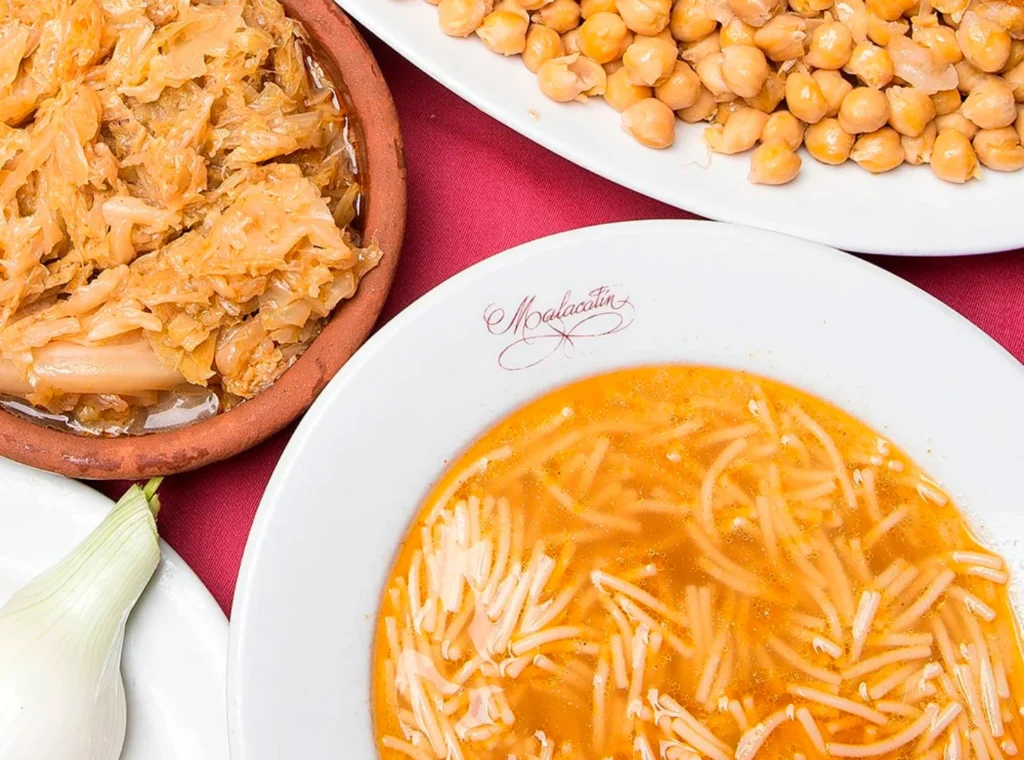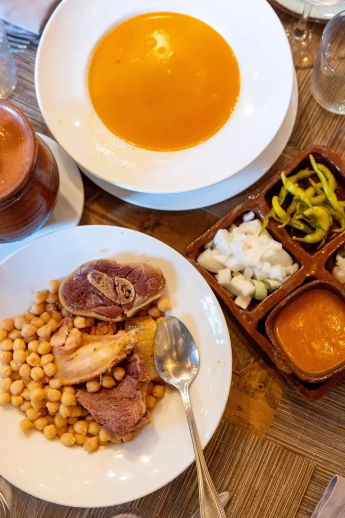 El comensal puede allí disfrutar de su sopa de fideos, con un potente sabor y color. Le siguen los garbanzos y el repollo y, para terminar, las carnes, enriquecidas con un pollo entero y una deliciosa salsa de tomate con comino.
