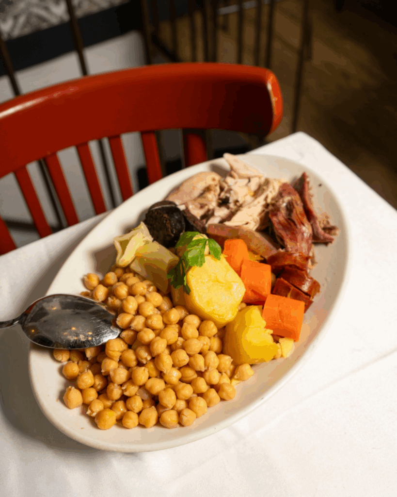 Clásico entre clásicos, Casa Carola sirve uno de los cocidos más celebrados de Madrid, siempre en tres vuelcos. La sopa humeante abre paso a unos garbanzos de cosecha propia y verduras frescas, rematados por un desfile de carnes: añojo, pollo, chorizo, morcilla casera, tocino ibérico, codillo y huesos de caña. Tradición pura y contundente.