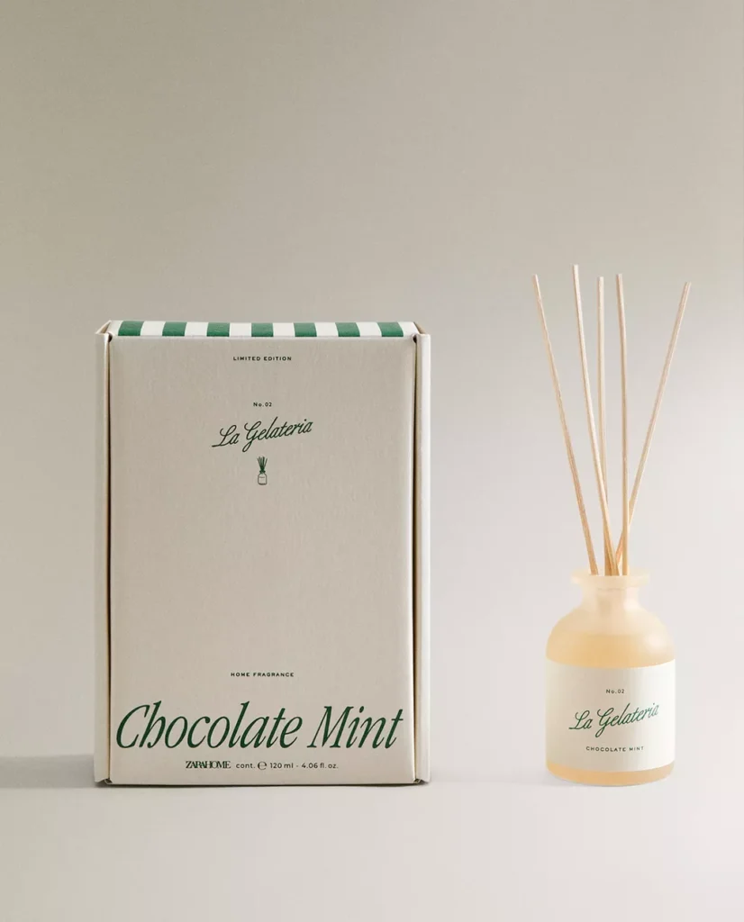 Zara Home quiere que nuestro hogar se impregne de notas de chocolate y menta, incorporando este nuevo sabor a su gama ‘La Gelateria’ en la que despliega una suculenta variedad de aromas comestibles entre los que encontrar fragancias de vainilla y nueces o vetiver y mango.
