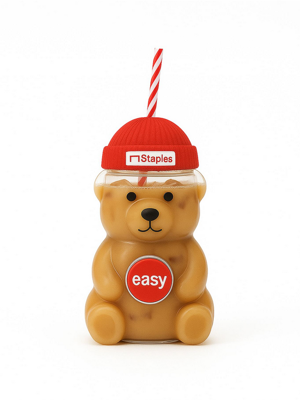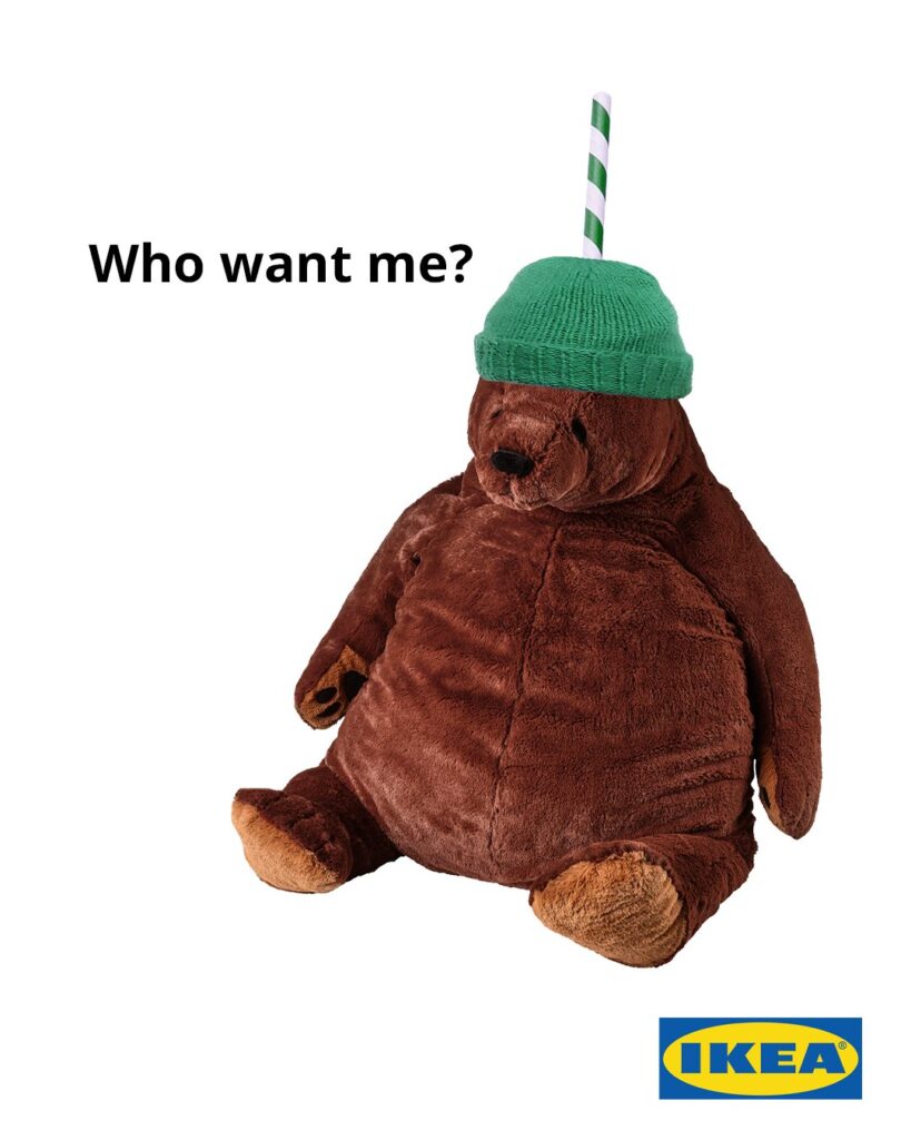 Por otro lado, Staples, dedicado al material de oficina, no quiso perder la oportunidad de esculpir su propio oso, sustituyendo el verde por el rojo, y añadiéndole un botón de ‘Easy’ en la barriga. IKEA Canadá también aprovechó su enorme influencia para lanzar un peluche enorme con el característico gorro y la pajita clavada a rayas. Por no hablar de las copia prácticamente exacta a la de Starbucks que ha hecho Aliexpress.