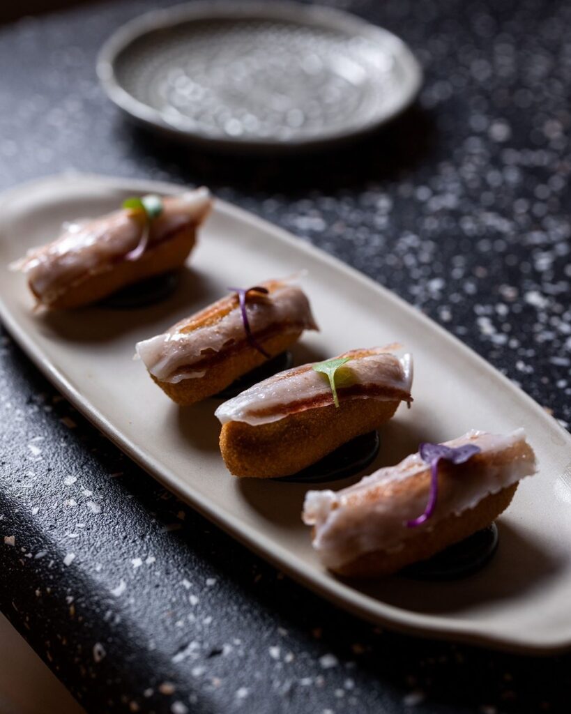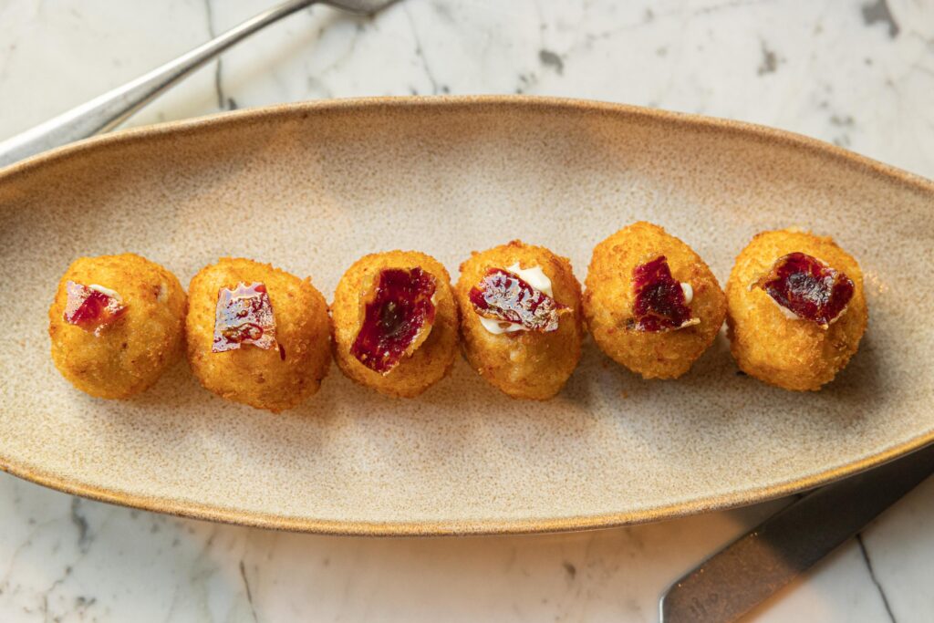 La croqueta aquí se presenta como una sofisticada representación de la artesanía gastronómica fusionada con el producto mediterráneo que da pie a algunos de sus grandes hits culinarios: las Croquetas de Carabinero, Velo Ibérico y Alioli de Ajo Negro, que captura la esencia del mar y la tierra en cada bocado.