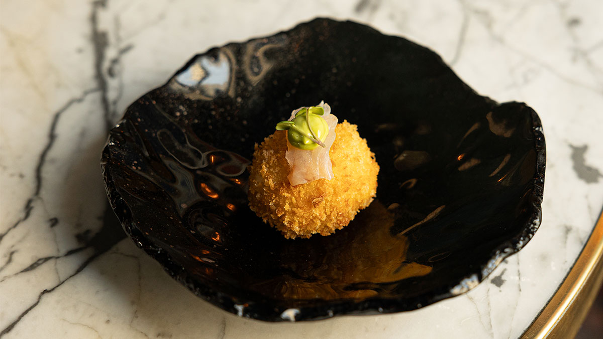 La croqueta aquí se presenta como una sofisticada representación de la artesanía gastronómica fusionada con el producto mediterráneo que da pie a algunos de sus grandes hits culinarios: las Croquetas de Carabinero, Velo Ibérico y Alioli de Ajo Negro, que captura la esencia del mar y la tierra en cada bocado.