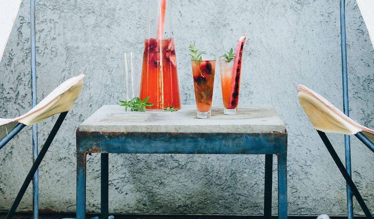 Ingredientes: frambuesas, azúcar, vinagre de vino tinto, agua, ramitas de menta, Beaujolais, brandy de cereza, zumo de lima y hielo.