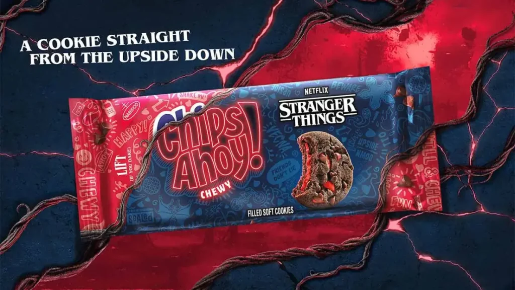 Las Chips Ahoy se presentan con una combinación de chocolate y fresa que da como resultado un relleno en rojo sangre que evoca el color de la dimensión paralela de la serie. La misma identidad gráfica recubre el packaging con un diseño retro junto a otros elementos como las monstruosas ramas de Vecna.