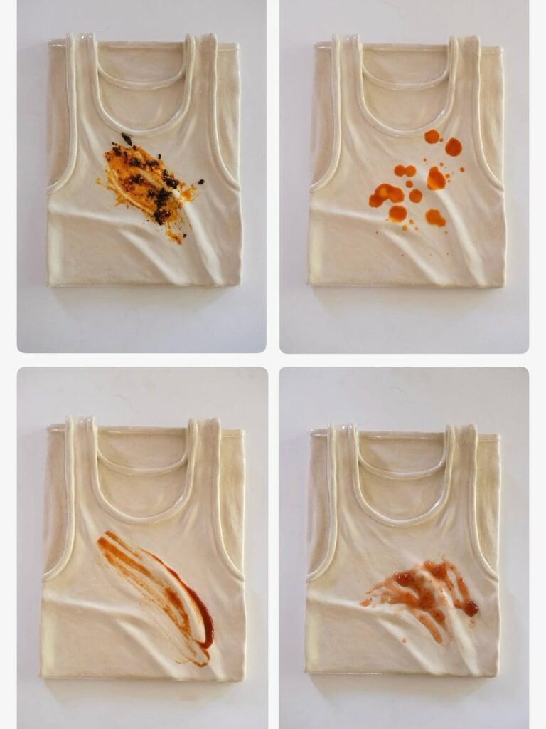 En el archivo artístico de la ceramista coreana podemos encontrar algunas piezas destacadas, como una serie de camisetas interiores manchadas con distintas salsas que titulan las piezas: del condimento chino laoganma, de la salsa picante mexicana cholula, de ketchup de Trader Joe’s, de la mermelada de fresa de Bonne Mman y de zumo de kimchi casero. La suciedad se funde con la belleza, y se perfila en brillantes camisetas interiores, todas en el mismo formato.