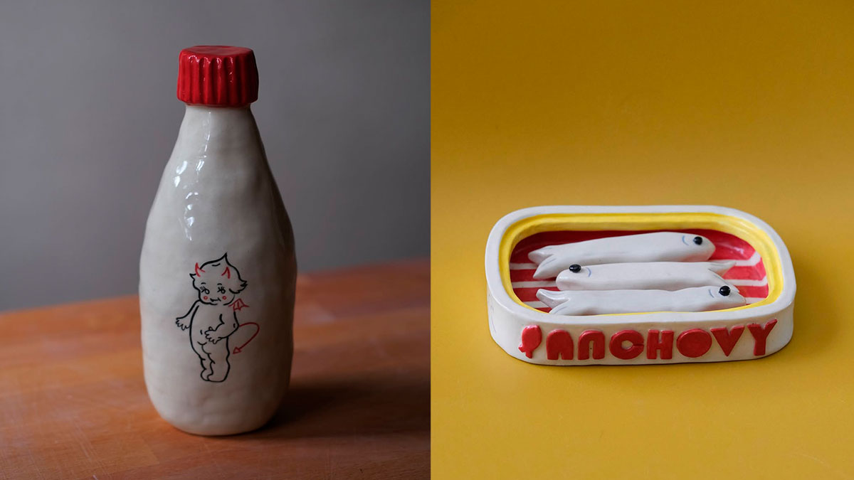Un plátano de portavelas, una lata de anchoas, cuchillos de carnicero o una botella de leche decorada con un bebé demonio. Esther Choi es especialista en transformar objetos cotidianos en obras de arte a través de la cerámica como medio de expresión.