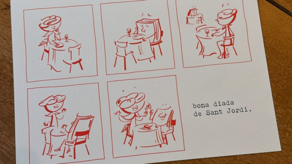 La viñeta se entregará como obsequio a los clientes que pasen por las mesas de ambos restaurantes entre el 20 y el 25 de abril, acompañando las sobremesas de Sant Jordi con un recuerdo artístico de la celebración.