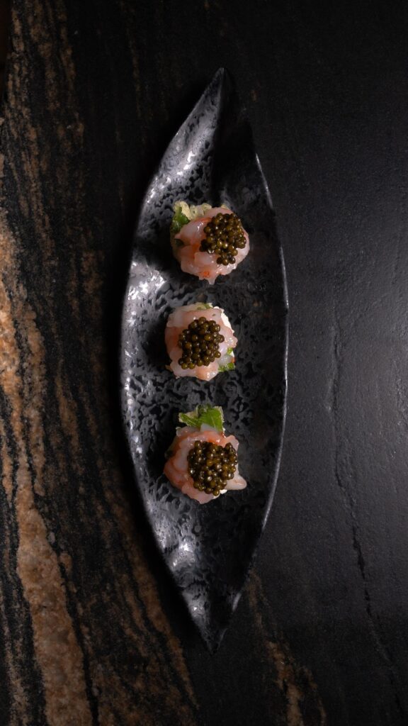 El viaje culinario puede empezar de muchas maneras, pero la mejor manera es hacerlo con entrantes frescos y aromáticos como el babaganoush de berenjena asada con yogurt y granada o el hummus con zaatar con los que dar paso a un sofisticado carpaccio de ternera trufado. La travesía también abarca referencias al recetario japonés, presentes en elaboraciones como los uramaki de gamba en tempura con mayonesa kimchi o de hamachi, el salmón miso -uno de los grandes favoritos de la carta-, o el delicado nigiri con ponzu trufado.