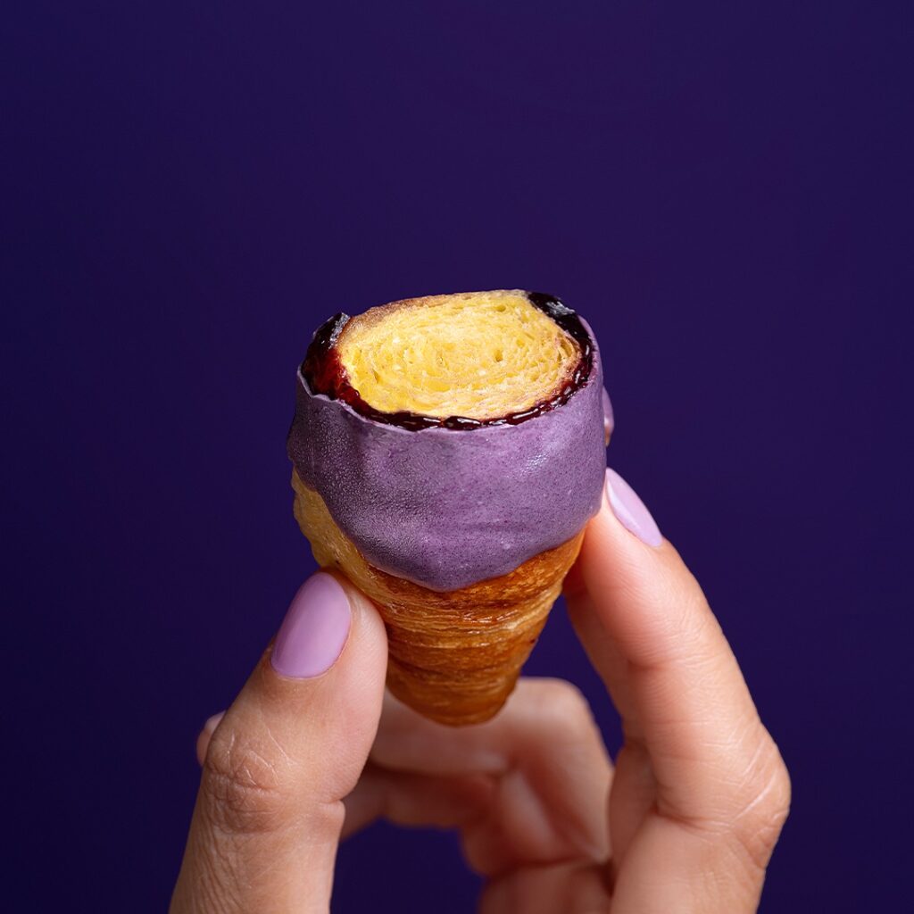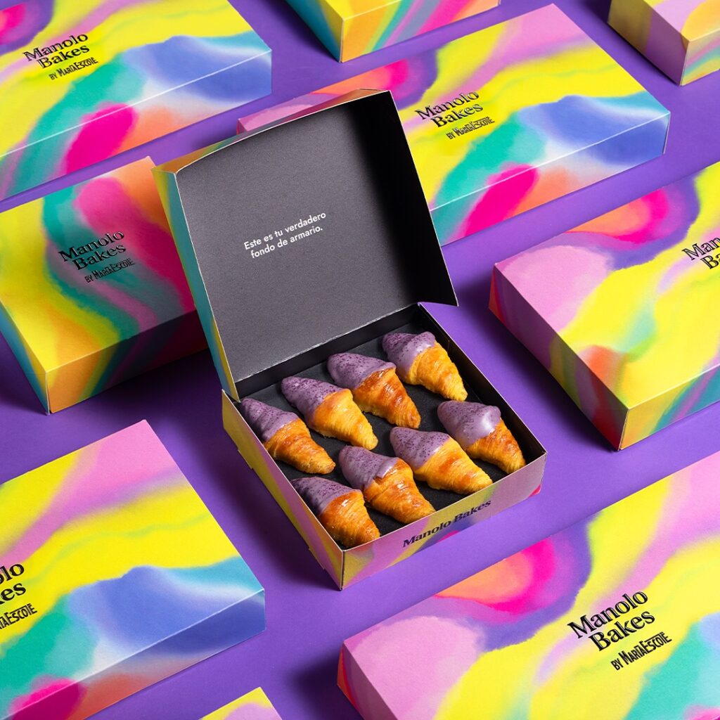 Manolo Bakes ha querido reimaginar la paleta cromática del otoño con María Escoté, la diseñadora de culto nacional que ha llevado la moda a la cafetería con una nueva colección de manolitos y palmitas vestidos con una doble cobertura de chocolate y mermelada de arándanos. Los dulces para la temporada AW25 se perfilan además con un polvo de UBE que le confiere ese toque extra de magia.