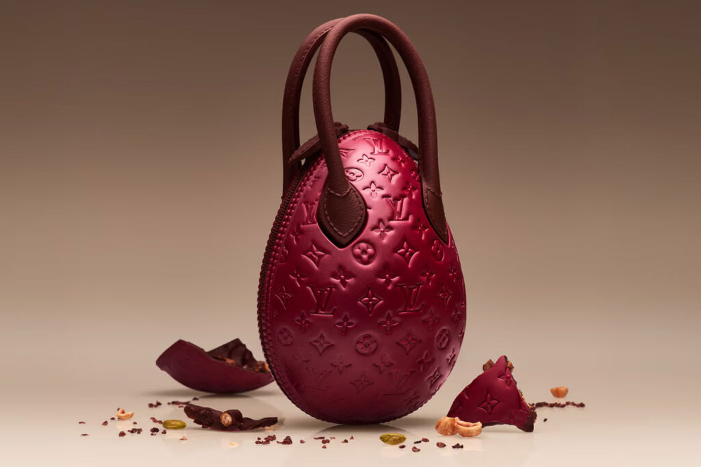 La pieza de chocolate -que toma como referencia la silueta “Egg Bag” de Vuitton- se viste en esta ocasión de un intenso tono rojo con acabado metálico, y se impregna de todo lujo de detalles. Desde los intrincados patrones distintivos de la firma hasta la correa artesanal «de cuero».