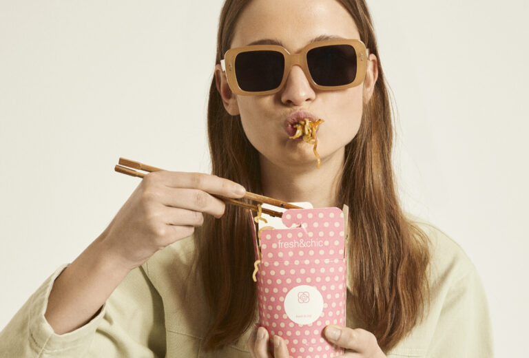 Gafas de pasta de JO&MR.JOE y chaqueta vaquera de GREEN COAST. Karina está comiendo Yakisoba Vegetal y huevo a baja temperatura de MISS SUSHI.