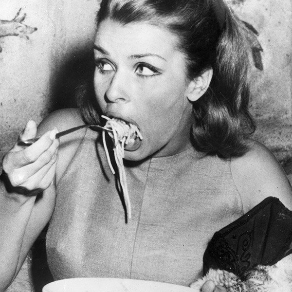 20th September 1966: Austrian actress, Senta Berger enjoying a plate of spaghetti at the Cinecitta in Rome during the filming of 8Operation Saint Gennarioe. (Photo by Keystone/Getty Images)