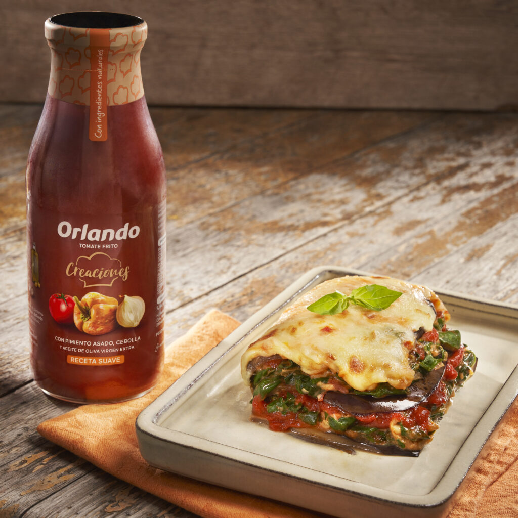 2. A continuación, echamos el tomate Orlando Creaciones Suave y por último ponemos otra capa de berenjena.