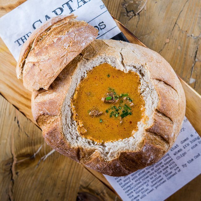 Se llama Pan Cook. O si lo prefieres, Bread Bowl o Pan Bowl y es sencillamente una mini hogaza de pan de unos 15 centímetros de diámetro que se utiliza para servir, previamente vaciada, algún guiso, sopa o una crema para dipear. “Nosotros utilizamos un pan con una corteza consistente, pero crujiente, para que no se desmorone cuando colocamos el relleno en el interior. Intentamos además dejar la menor cantidad de miga en su interior para que no resulte muy pesado y para terminar colocamos la tapa del pan que hemos extraído para poder vaciarlo de modo que ayude a que se mantenga el calor”, nos cuenta Diana González de Bendita Locura Coffee & Dreams