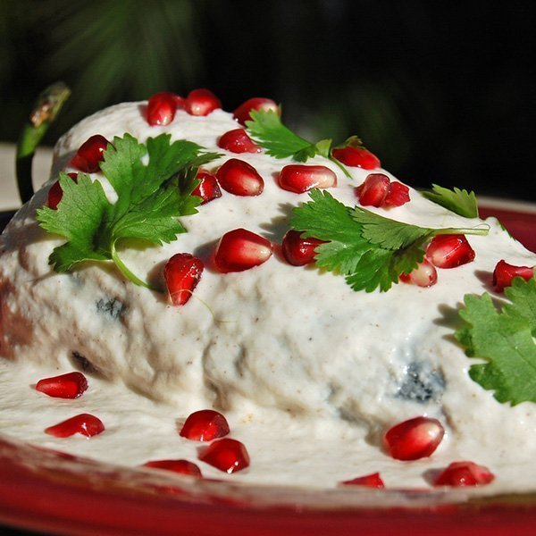 Colocar sobre el plato el chile, bañarlo con la nogada, y agregar encima los granos de granada y las hojas de perejil.