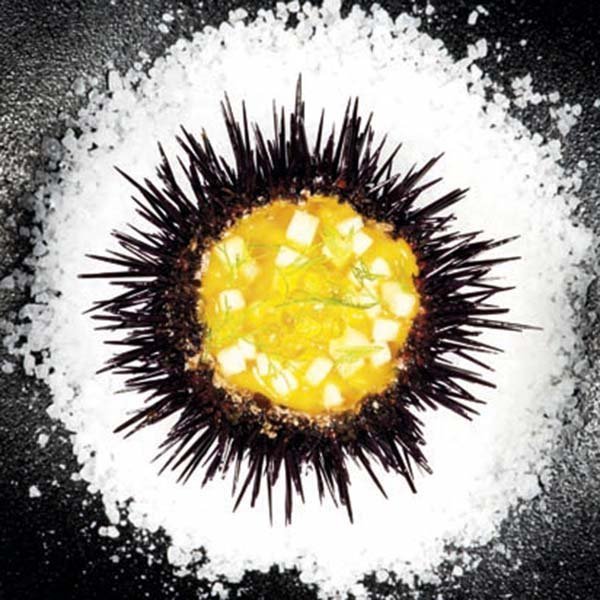 Abrir, limpiar y escoger las huevas de los oricios antes de reservarlas. Limpiar bien cuatro cáscaras de oricios con un chorro caliente de agua, y repartir entonces las huevas de los 16 oricios en esas cáscaras ya limpias. Pelar y picar el mango, pasarlo por la licuadora y emulsionarlo con aceite de oliva. Poner dos cucharadas sobre las huevas. Para adornar el plato, picar la manzana, el apio y el hinojo en trozos pequeños y ponerlos encima de la emulsión de mango.