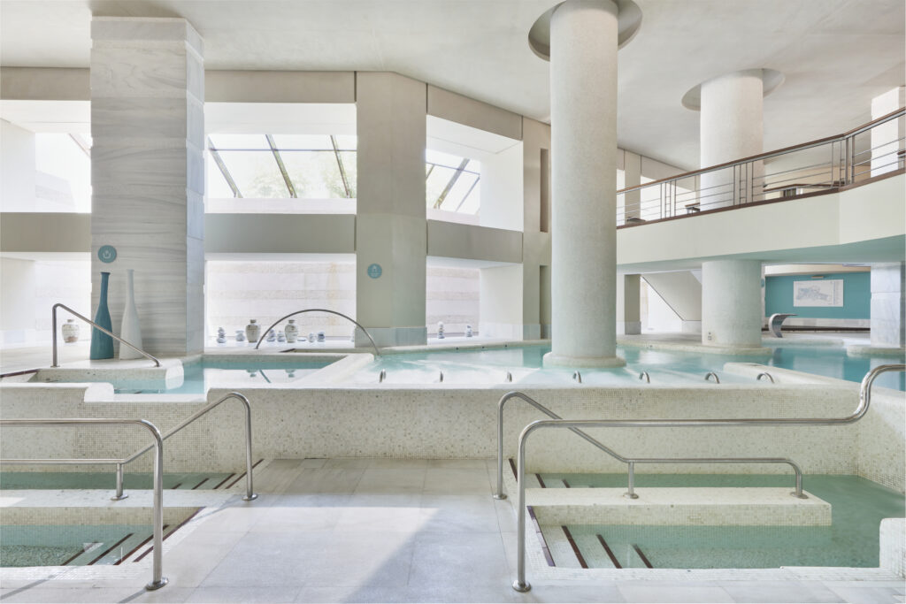 El spa se distribuye en dos plantas que presentan un circuito con piscinas, tumbonas térmicas, baños turcos, duchas de sensaciones y tratamientos de belleza con los que elevar la experiencia sensorial del hotel.