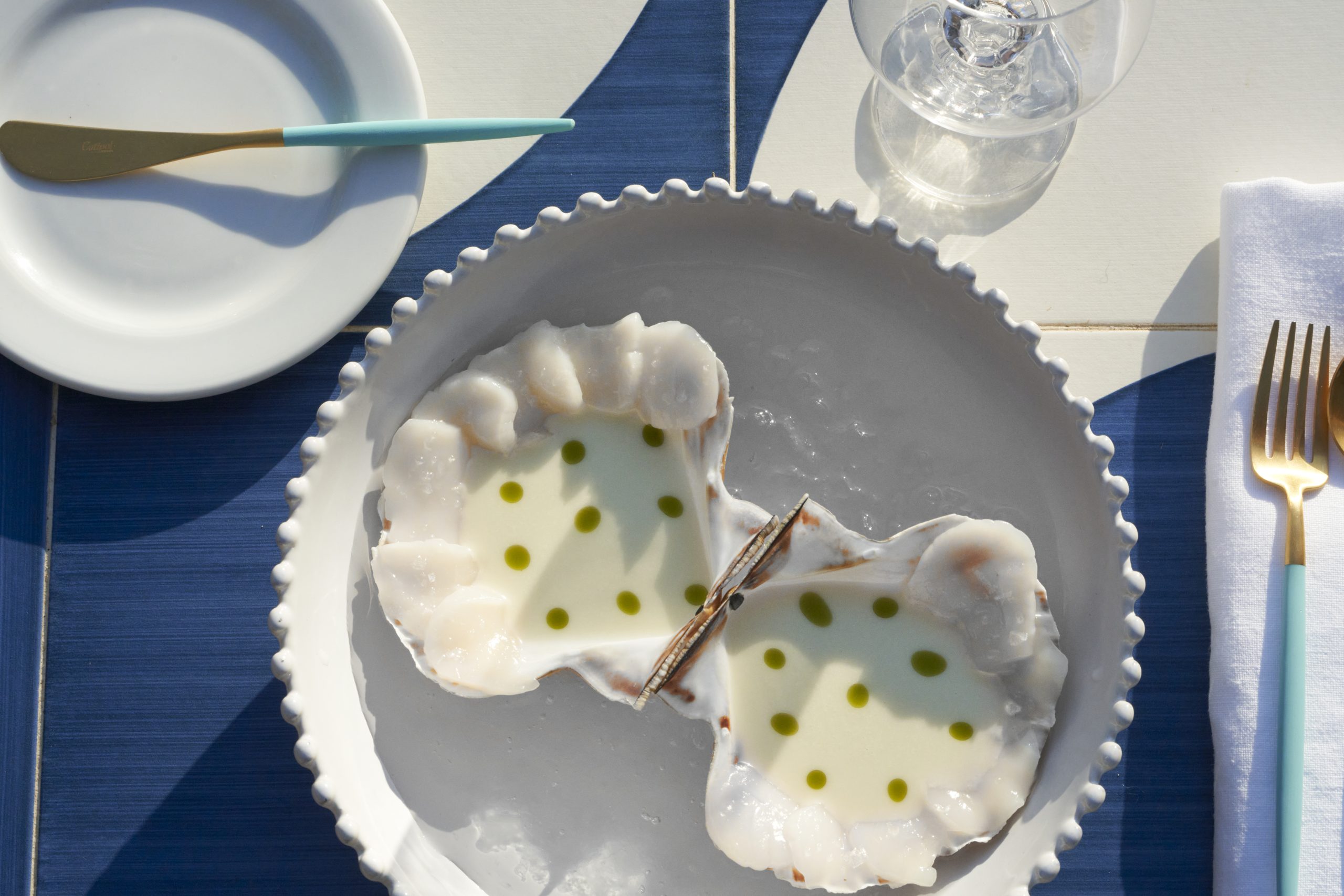 En medio de ese escenario que evoca la elegancia parisina y la esencia costumbrista andaluza, se instalan una serie de mesas vestidas de azulejos vidriados, que emergen de olas creadas en el suelo, y se funden con el mar de fondo.