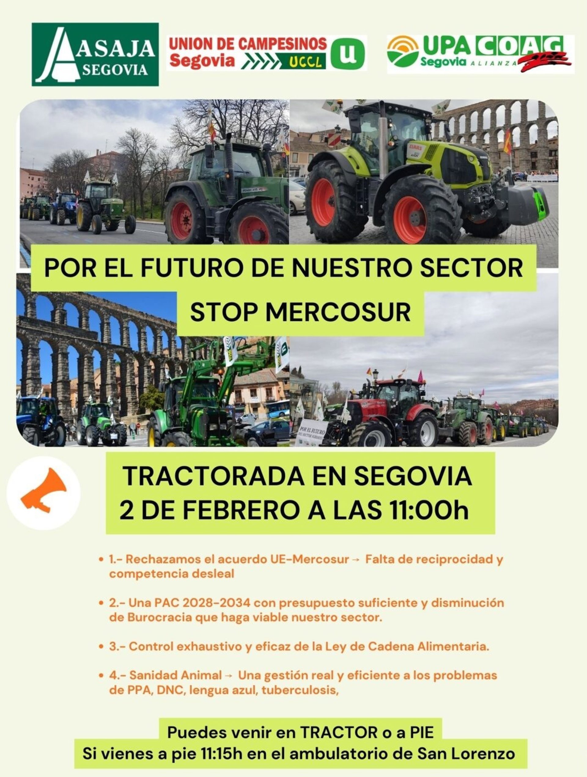 Bajo el lema ‘Por el futuro de nuestro sector. Stop Mercosur’, la tractorada, convocada por Asaja, UCCL y la Alianza UPA-COAG, partirá a las 11.00 horas con cuatro reivindicaciones, entre ellas manifestar el rechazo del sector por la «falta de reciprocidad» y por la «competencia desleal» de los productos que llegarán de Brasil, Argentina, Uruguay y Paraguay.