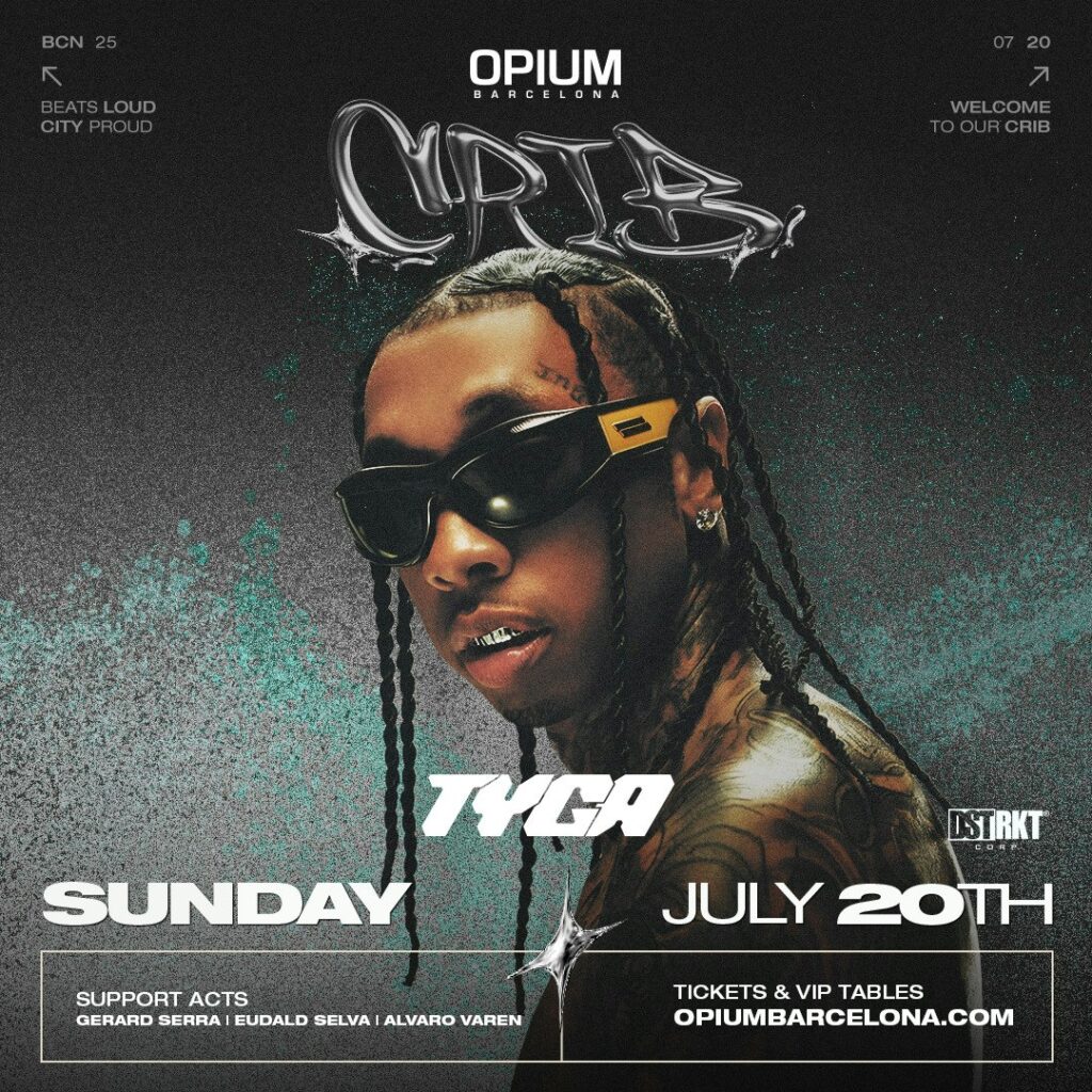 Al caer la noche nos dirigiremos a Opium Barcelona para asistir al concierto de Tyga. El rapero multiplatino, nominado al GRAMMY, se subirá al escenario de la fiesta dominical CRIB para que todos podamos vibrar en la misma frecuencia de sus sonidos y temas icónicos como ‘Faded’, ‘Taste’ o ‘Rack City’ que consolidaron en su día su status en el mundo del rap.