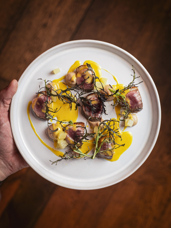 La carta evoluciona y cambia, siguiendo las estaciones, aunque existen algunos imprescindibles que se mantienen por su status adquirido. Desde la gilda de la casa con pepinillo encurtido, hasta el calamar con cebolla caramelizada o el filete asado con yema de huevo servidos en platos rectangulares, en honor a su nombre.