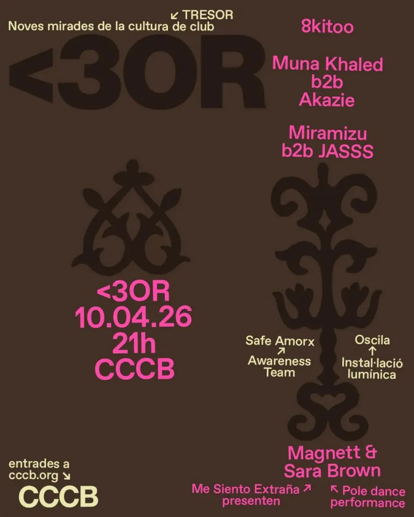 Por la noche nos iremos de fiesta a <3Or en CCCB, la sesión más progresiva del sistema que se iniciará con el pole dance de Magnett y Sara Brown. La fiesta continuará con los DJ sets de 8kitoo, Muna Khaled b2b Akazie, y Miramizu b2b JASSS. Consigue aquí tu pase.