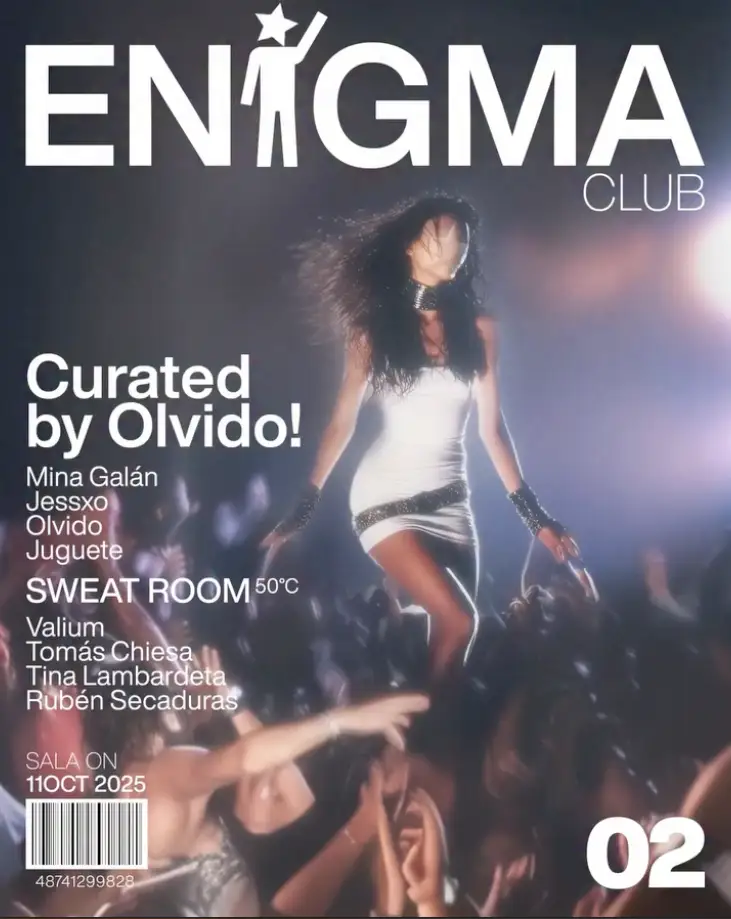 La sesión nocturna la continuaremos hasta que el amanecer en EN1GMA by Olvido. Una fiesta que presenta una edición especial y/o una «curaduría hecha para sudar en seda» con un line-up conformado por Mina Galán + JESSXO + Olvido + Juguete + Valium + TINA (ES) + Rubén Secaduras + TOM CHIESA, los cuales llevarán la electrónica a una nueva dimensión. Atención: el dress code consiste en ir vestido de blanco.