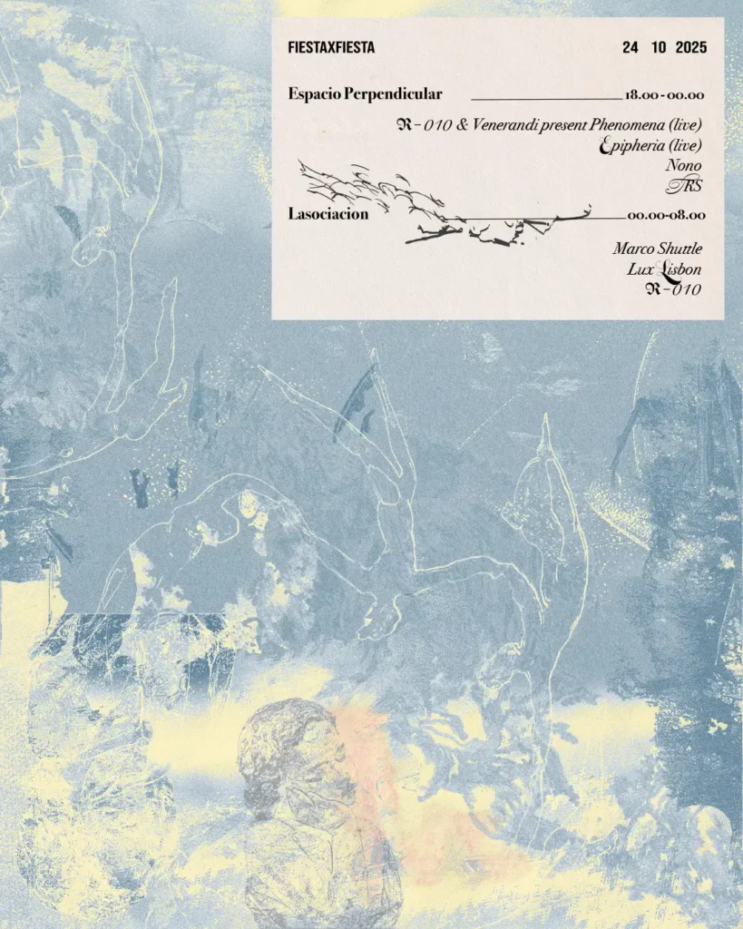 Al acabar el concierto, romperemos ese momento íntimo con la ‘Fiesta x Fiesta‘ suministrada por Marco Shuttle, Epipheria, Lux Lisbon, Nono, TRS, R-010 y Venerandi. Un elenco de djs que abarcará desde paisajes sonoros etéreos hasta el techno más hipnótico y vanguardista para hacernos bailar desde la tarde hasta la noche con shows en directo y sets memorables. Atención: para conocer el lugar del evento, deberás comprar primero las entradas.