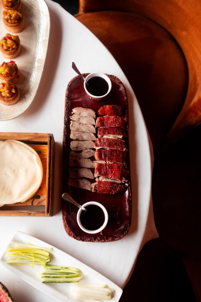 En mesa, el pato se acompaña de una salsa hoisin casera elaborada con miel de flores, bastones de melón y pepino fresco, finas tiras de puerro argenta y crepes hechos a mano, que permiten al comensal preparar sus propios rollitos de manera tradicional.