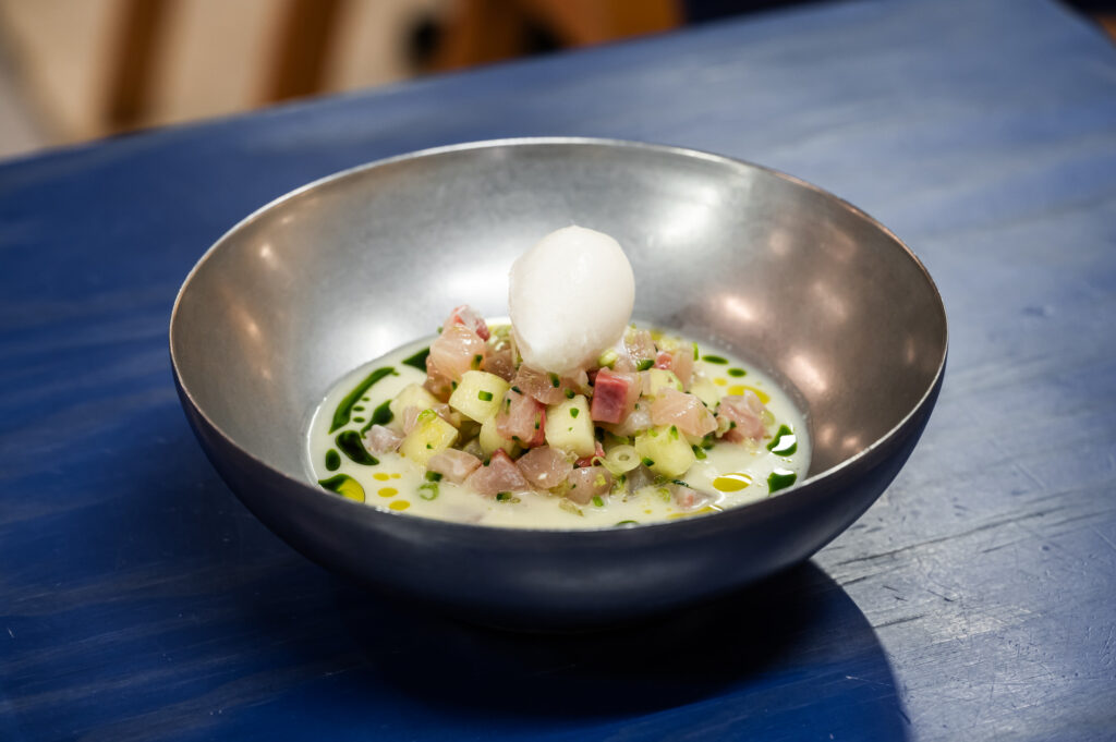 El restaurante de mercado sirve sobre la mesa nuevas creaciones llenas de color y matices -con influencias de Asia, Europa y Latinoamerica-: un tiradito mixto de corvina y gamón con leche de tigre de ají amarillo ahumado; unas flautas de langostino crujiente servidas con tortilla de maíz y mayonesa de kimchi morita; un tartárica de hiramasa con leche de tigre de raifort y habanero; y una lubina abierta zarandeada adobada con chiles mexicanos que refuerza su arte con las brasas.