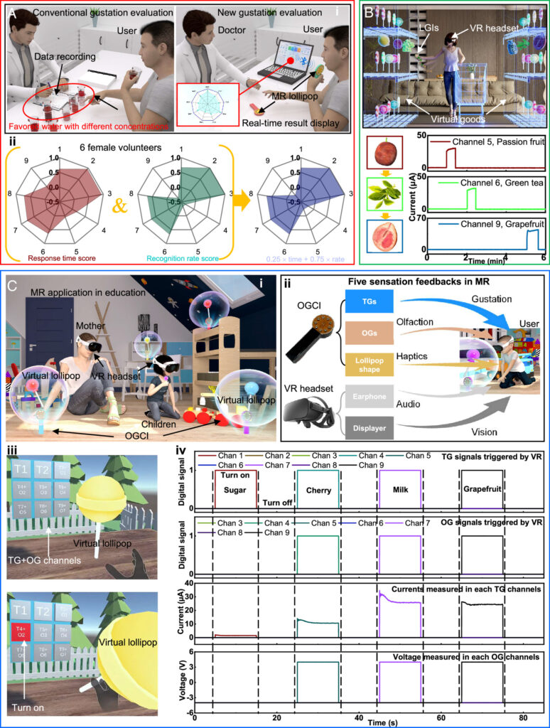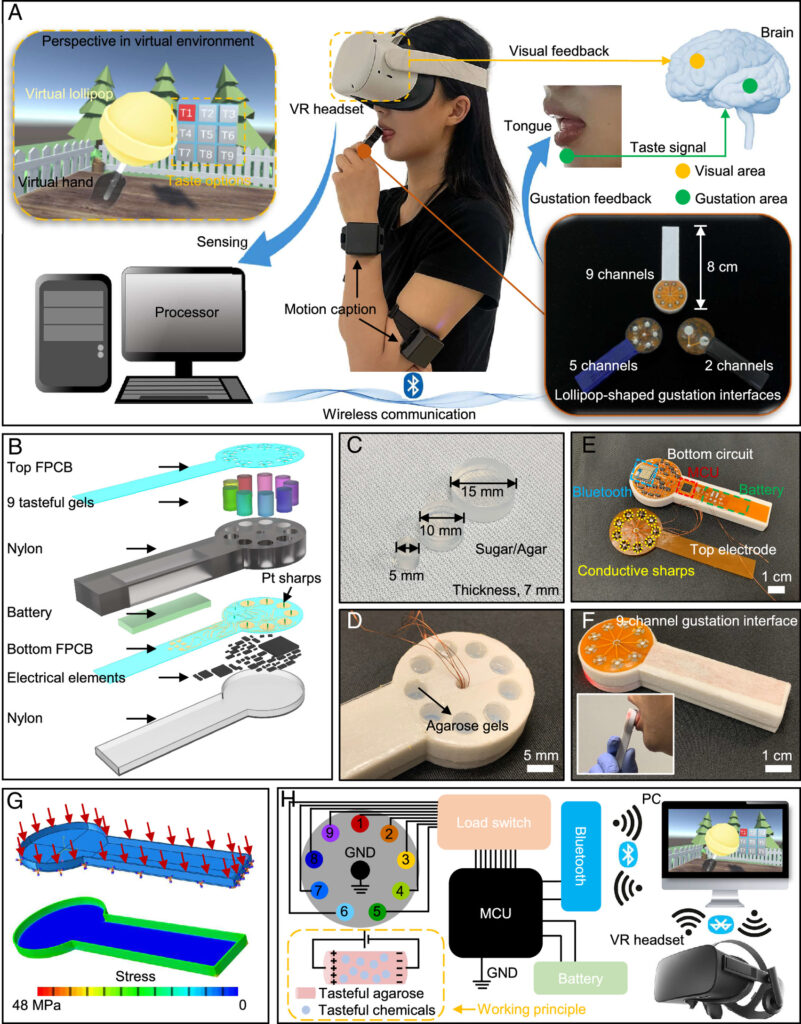 El dispositivo o la «boquilla de RV«, que adquiere el aspecto de una piruleta, ha sido desarrollado por un equipo de investigadores de Hong Kong, los cuales afirman haber encontrado la forma de dar sabor mediante estimulación eléctrica y una pequeña cantidad de hidrogeles aromatizados.